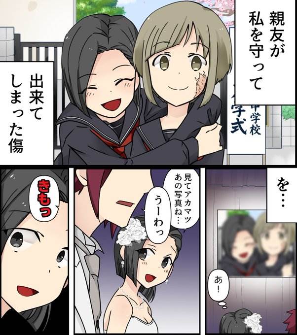 そして年月が経ち、私の結婚式。スライドに映る親友の笑顔とその傷に、会場の誰かが軽々しく「きもっ」と言い放つ瞬間、胸が締めつけられました。