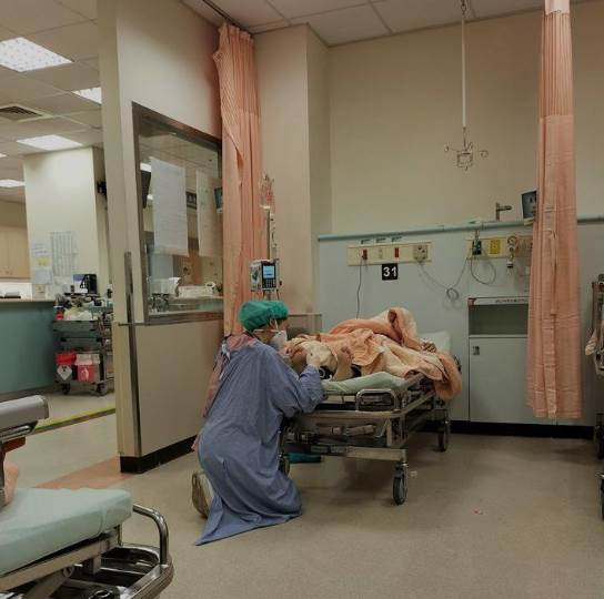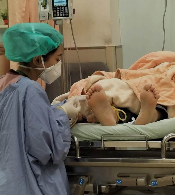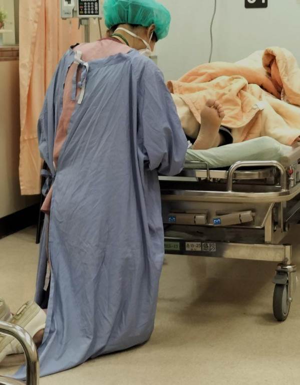 その瞬間、看護師は気づかぬうちに膝をついて、顔が患者の足元に近づき、ひたむきに処置を続けていました。患者の足元に顔を近づけ、処置が順調に進んでいるかを確認するために姿勢を低くしているその様子は、まさに献身的な態度そのものでした。看護師は一切汚れを気にせず、仕事に集中していました。この姿を見たユーザーは、この感動的な瞬間をみんなと共有しようと、写真をアップロードしました。