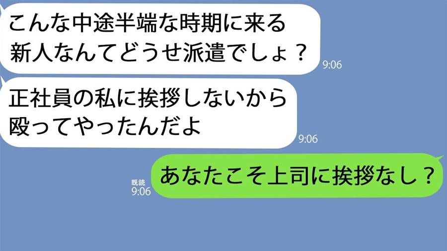 「LINE」で産休明けに職場復帰した際、コネ入社の新人に殴られたエピソードが笑える。新人は挨拶しなかったが、私の立場を知らなかった模様。それを丁寧に教えてあげると、結果は笑える展開になった。