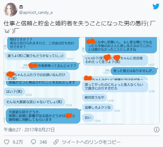 杏さんはすべてを友人に報告し、結果、この男性は貯金と仕事と婚約者を失うこととなってしまったようです。