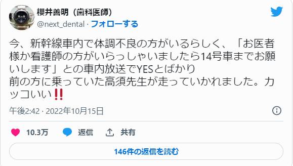 他の乗客の方の「車内アナウンス呼び掛けに数人の医師が駆けつける中に、高須先生がいてびっくり」みたいなツイートを見たのですが、きっと同じ列車に乗っていらしたのですね 具合が悪かった方は持ち直してこられた様で、良かったですね。
