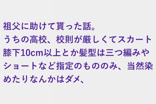 祖父に助けて貰った話。うちの高校、校則が厳しくてスカート膝下10cm以上とか髪型は三つ編みやショートなど指定のもののみ、当然染めたりなんかはダメ、みたいな感じで私たちからしたら時代遅れと感じる校則が沢山残っているところでした。私は水泳部だったんだけど、水泳って毎日してると髪の色が抜けて茶髪になってくる。中でも私は髪の色が変わりやすかったので、部を言い訳に髪を染めてる!と生活指導の先生に指摘された。生活指導の先生は2人いるんだけど両方体育教師で、体育教員室に呼ばれるとその2人に30分以上毎回怒られた。何度も説明したし美容師さんにも髪色が抜けやすいっていう話を紙に書いて貰って提出したんだけど全く効果なくて、髪を引っ張られて何度も泣かされた。